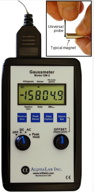 GM2 型設計用于測量強磁場和中等磁場,例如來自磁鐵和螺線管的磁場. 它使用起來快速直觀,具有極高的動態范圍,測量范圍為 0.0 至 19,999.9 高斯,步長為 0.1 高斯。大于 20000 高斯時,范圍會自動更改,讀數為 20.000 至 29.999 千高斯(20000 至 29999 高斯),步長為 1 高斯。因此,可以測量小至 0.1 高斯的變化,例如,在 14,000 高斯場(典型的永磁體強場)中。通過可選的高穩定性探頭,它具有 0.01 高斯分辨率。(高穩定性探頭范圍為 +/- 799.99 高斯)。GM2 還可以測量高達 10,000 高斯的交流場??焖俜逯当3止δ埽? 毫秒窗口)捕獲并顯示任何瞬變,無論是正的還是負的。此外,可以根據需要選擇兩種快速(2 毫秒)報警功能中的任何一種。