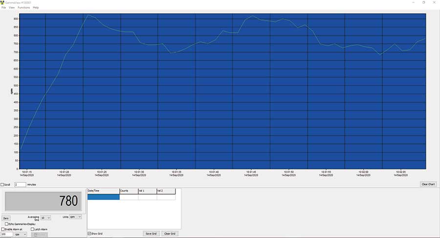Observer USB軟件讀取Total Counts、CPM、μR/hr、mR/hr、CPS、μSv/hr,并能夠收集、記錄接收到的數據、設置校準日期和設置,以及回顯PC上收集的讀數。數據顯示在圖形和數字屏幕儀表上。數據可以通過各種方式保存或打印,包括電子表格格式。可以為圖形上的每個點調整停留/計數時間,并且可以設置計數的時間長度。軟件顯示屏具有可調節的設置和可設置的警報。