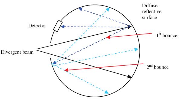 積分球用于測量發(fā)散光源。如圖所示,積分球的內(nèi)表面涂有以散射、非鏡面方式高度反射(通常為 99%)的表面。因此,當(dāng)發(fā)散光束射到積分球壁上時,光線會被反射和散射多次,直到射到球壁上任何地方的光都具有相同的強(qiáng)度。因此,放置在球體中的檢測器獲得與其他任何地方相同的強(qiáng)度,并且檢測器檢測到的功率與與光束發(fā)散無關(guān)的總?cè)肷涔β食烧取#z測器的布置使其只能看到散射光,而看不到入射光束。)理想的積分球具有具有朗伯反射特性的表面。這意味著入射到表面上的光在表面上方 2pi 球面度立體角的所有方向上均勻散射。Ophir 積分球頭中使用的表面非常接近朗伯表面。