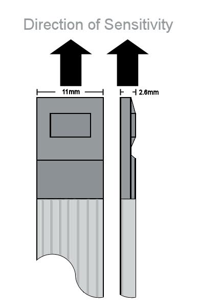 傳感器安裝在一根8線電纜的末端,電纜通常有4英尺長,但也可以定制其他長度。傳感器是“軸向”的,這意味著它檢測與電纜點方向相同的場分量(見箭頭照片)。當傳感器指向磁鐵的南極,而指向北方時,儀表讀數為負。傳感器的小有源區域位于黑暗正方形的中心。