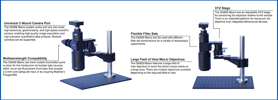 OASIS Macro 旨在對(duì)頭部固定小鼠的整個(gè)皮層或清醒動(dòng)物的大皮層區(qū)域的數(shù)千個(gè)神經(jīng)元群的活動(dòng)進(jìn)行成像。與傳統(tǒng)顯微鏡相比,與OASIS Macro兼容的鏡頭提供了更大的視野。