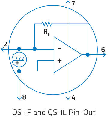 我們的 QS-VL 和 QS-IL 混合型探測器設計以較低的頻率在很大程度上提高電壓輸出,因此,探測器內包含電阻值在 100 GΩ 至 300 GΩ 范圍內的負載和反饋電阻。同時,此類探測器使用 8 引腳 TO 封裝,允許安裝“外部電阻器”以降低輸出并增加帶寬。左邊所示電路圖為 QS5-IL 探測器(帶 MT 涂層)的典型試驗接線圖。另一方面,我們的 QS-IF 系列設計用于高帶寬應用,因而內含一個較小的 100 MΩ 反饋電阻。