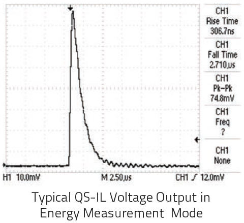如果您需要在全光譜范圍內測量脈沖激光從 nJ 到 mJ 的性能,那么我們的熱釋電探測器是您的理想選擇!左圖的示波器軌跡為 QS9-IL 與作為積分焦耳計的 QS-I-TEST 配合使用時的典型輸出。請注意,該軌跡很快上升到峰值,然后較為緩慢地下降,這一軌跡由為積分電路選擇的 RC 時間常數決定。在這一配置下,您可以測量絕對脈沖能量、重復頻率和脈沖穩定性。源的最大脈沖寬度由您選擇的 RC 時間常數決定,脈沖可以非常短!