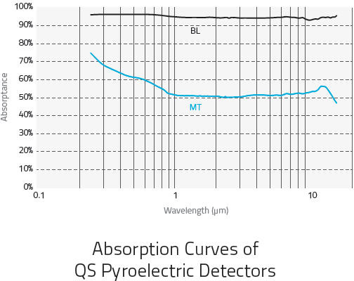 與光導和光電探測器不同,我們的熱釋電感溫探測器不局限于電磁頻譜的一小部分。它們是真正的廣譜探測器,靈敏度在 0.1 μm 至 3000 μm(遠紫外、遠紅外和太赫)之間。我們的涂層或熱釋電晶體所吸收的任何輻射都將產生可測量的信號。左圖中的兩條曲線所示為涂有 MT 涂層和 BL 涂層的探測器的相對光譜響應。請注意,根據可靠文獻,這些曲線的 NIST 溯源校準部分在 0.25 μm 至 15 μm 之間。對于大于 15 μm 的測量,目前沒有可追溯的光學標準。