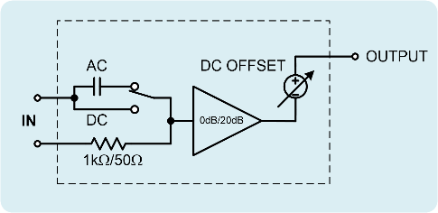 TS250 波形放大器輸入信號施加到前面板上的 BNC 連接器。輸入首先由可選擇的耦合調節。TS250 輸入為交流耦合或直流耦合。這使得 TS250 能夠更加靈活地與網絡分析儀和函數發生器等各種儀器配合使用。使用交流耦合設置來阻止任何輸入直流電壓。使用直流耦合設置可以放大源直流電壓。例如,如果您希望波形放大器輸出與函數發生器相同的電壓,請使用直流耦合、50Ω、0dB 增益,并將直流偏移調整為 0V。