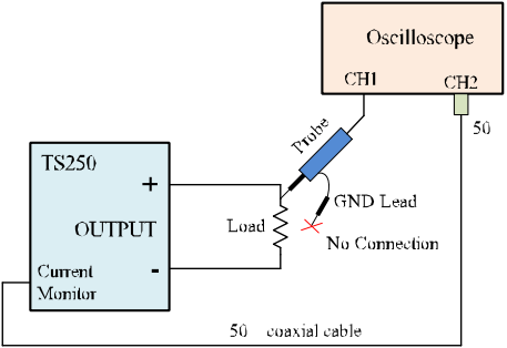 TS250 波形放大器包括一個電流監視器輸出,可連接到示波器以監視波形電流。當端接到 50Ω 時,電流監視器增益范圍為每安培 100mV。例如,2A 輸出電流將在電流監視器輸出上產生 200mV 輸出電壓。如果示波器設置為高阻抗(1MΩ),則輸出電壓將為200mV/A。特別是對于高頻或方波,建議使用 50Ω 端接。如果示波器沒有內置 50Ω 端接器,您可以購買TS220 外部 50歐姆端接器來自我們。使用圖 2 將電流監視器連接到示波器。如果如圖 2 所示同時監控電流和電壓,建議不要連接電壓探頭接地線。