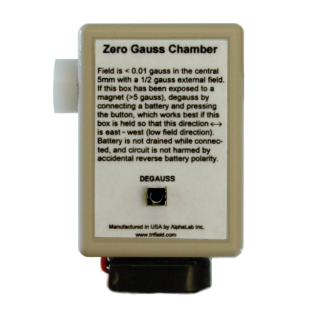 用外部消磁器消磁零高斯腔是困難的,即使消磁器是可用的。通常,外部消磁器的強度不足以消除內(nèi)部屏蔽層的磁性,使用消磁器(相當大)也不方便。當使用 ZGC 時,只需按一下消磁按鈕,內(nèi)部場就會在室中心5mm 寬 x9.4 mm 直徑區(qū)域內(nèi)小于0.01高斯(在所有三個軸上)。連接電池時,除按消磁按鈕外,不消耗任何電源。即使這樣,一個典型的9伏電池(包括)可以超過1000萬消磁周期的電力。消磁后,無論腔室的方向如何(在地磁場內(nèi)) ,磁場都小于0.01高斯。如果在消磁過程中,腔室的長軸(下圖中的左右方向)特別指向東西方向,那么內(nèi)部磁場將小于0.002高斯,盡管大多數(shù)高斯計并不需要這樣的精度。