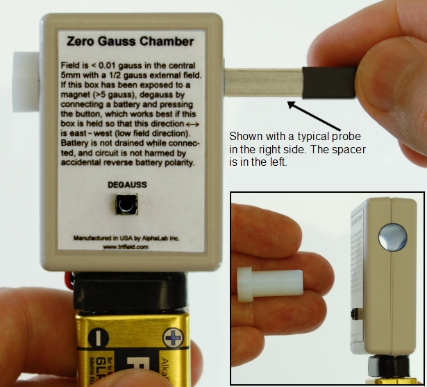 白色塑料部分(間隔器)可以在任何時候拆卸,但如果你想將高斯計探頭置于腔室的中心,就應該使用它。當放置在任何一端時,這個白色墊片將允許探針的一端插入到距離腔室中心1.6毫米處。因此,AlphaLab模型VGM, GM-2, GM-3, 1-ST和1-HS的實際傳感器將在腔室中正確地居中。零高斯區(qū)域直徑9.4毫米(0.370“),并占據(jù)中心5毫米(0.197“)在腔內(nèi)。(腔室的長軸尺寸為36毫米,或1.42英寸)。在中心5毫米處,無論腔室朝向如何,按下黑色消磁按鈕后,磁場均< 0.01高斯。在消磁時,只要腔室不從其方向旋轉(zhuǎn)超過30度,它將保持< 0.01高斯。(請注意,如果室外的磁場小于0.6高斯,這是地球磁場的特征,則此規(guī)范有效。)插入如下所示的高斯計探頭并調(diào)零高斯計。