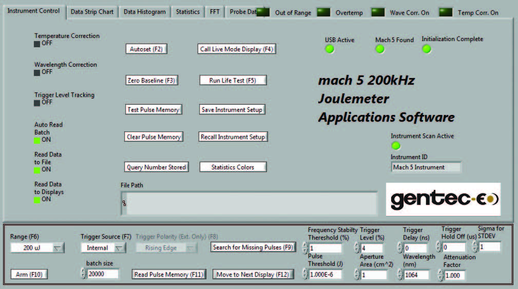 強大的 LabView 應用軟件包括許多的控制和診斷功能。左邊所示的儀表控制屏幕用于設置 MACH 6 的運行,包括量程、觸發、波長和其他項目。此外,還可通過該界面設置脈沖批大小并配置儀表,從而啟動數據采集。您可以通過該控制屏幕訪問“自動設置”、“調用實時模式”、“運行壽命測試”、“保存儀表設置”等功能。直接點擊或者按下相關的功能按鈕便可訪問這些功能。