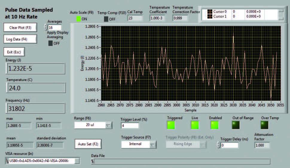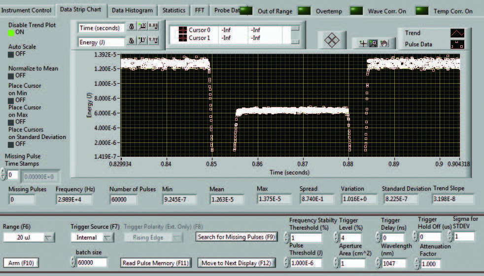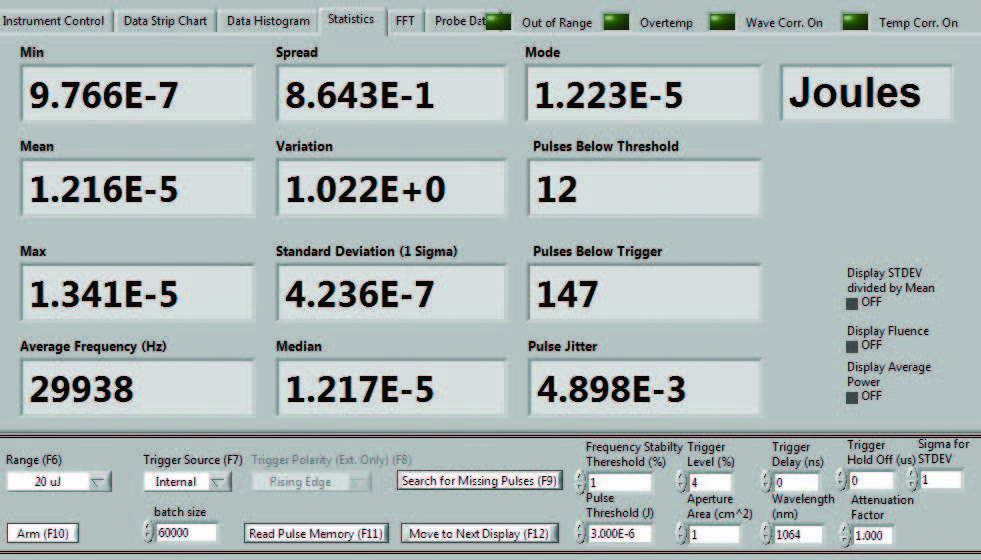 實時模式可從儀表控制屏幕訪問,您也可以簡單按下計算機上的“F4”功能鍵訪問該功能。在此模式下,由于需要在 10 Hz 頻率下采集激光脈沖樣本,儀表有意像普通慢速數字焦耳計一樣運行。該模式為您提供能量帶狀圖、實時能量讀數、統計數據和重復率。在設置激光器的 Mach 6 時,此模式非常有用。您可以選擇“自動設置”,使用這一功能時儀表會跑遍各個量程和觸發電平,直至其找到正確的范圍;您也可以手動進行設置。設置完成后,您將退出該界面并返回到“控制”界面,然后在該界面選擇批的大小,配置儀表并開始采集脈沖能量數據。