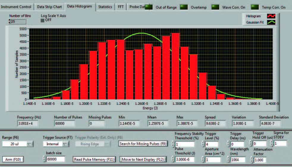 想查看脈沖能量數據組的統計分布嗎?直方圖界面可以幫您實現。直方圖將為數據擬合“高斯曲線”。直方圖會沿圖表底部顯示完整的統計計算連同脈沖頻率。在統計數據的下方,您可以看到量程和觸發等儀表控制鈕。您還可以根據需要調整觸發延遲和釋抑。