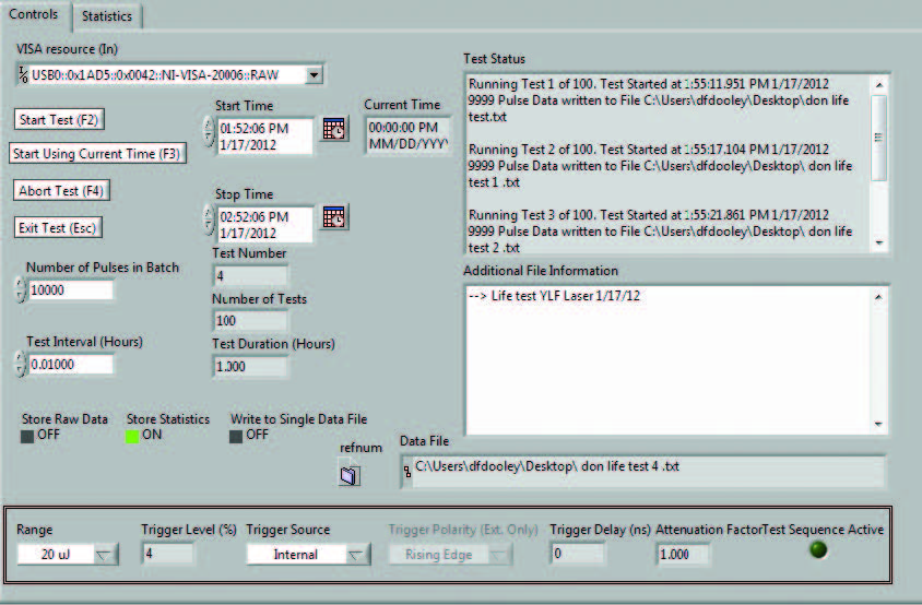 您是否希望對高重復頻率脈沖激光器開展壽命測試?是否想了解環境變化(例如溫度)對循環測試產生的影響?我們新增了一項強大功能,可助力您實現上述需求。在壽命測試界面中,您可自主選擇所需的統計指標,設定測試的起始日期與時間、結束日期與時間、脈沖數量以及測試間隔。您僅需指定一個用于存儲數據的文件,隨后點擊“開始”按鈕,之后便可放心離開、自由安排其他事務!待您返回時,將看到一套完整的數據集,該數據集會按您選定的時間間隔,記錄激光器的性能表現、溫度變化、沖擊情況、振動數據,或您關注的任何其他參數。