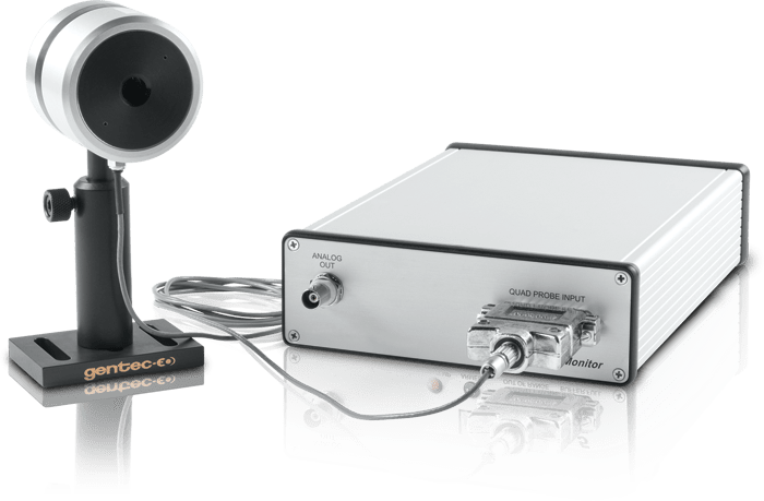 QUAD-4Track 的模擬輸出提供的電壓與照射各個 QUAD 元件的脈沖能或激光功率成正比。四個電壓輸出相等時,光束位于 QUAD 探測器的中心。在設置脈沖源的 QUAD 探測器以進行光學調準時,這一工具非常實用。