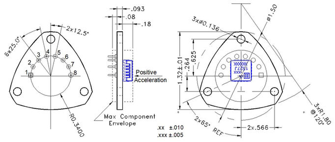 The 2227 is a low-mass, low-power module, electrically and mechanically compatible with fixtures and equipment designed for industry-standard quartz accelerometers and intended for use in inertial and tilt applications requiring zero to medium frequency response excellent long-term bias and scale factor repeatability, and low noise. The Model 2227 module combines a high-temperature, open printed circuit board (PCB) specifically designed to give the high stability required for inertial applications and SDI’s Model 1527 Tactical-Grade Inertial Navigation MEMS DC Accelerometer.