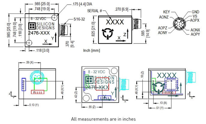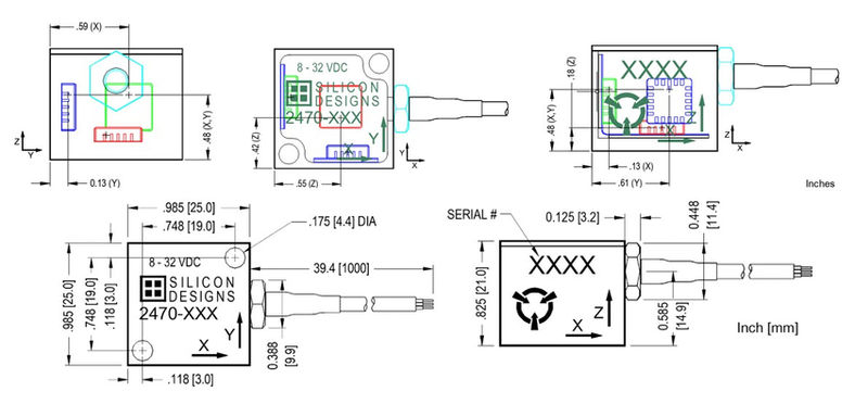 Onboard voltage regulation and an internal voltage reference eliminate the need for precision power supplies. The robust, anodized aluminum case is potted then epoxy sealed and can be mounted easily via two screws, an adhesive, or by attaching a magnet. Individual axis directions are marked on the case with positive acceleration defined as acceleration in the direction of the axis arrow.