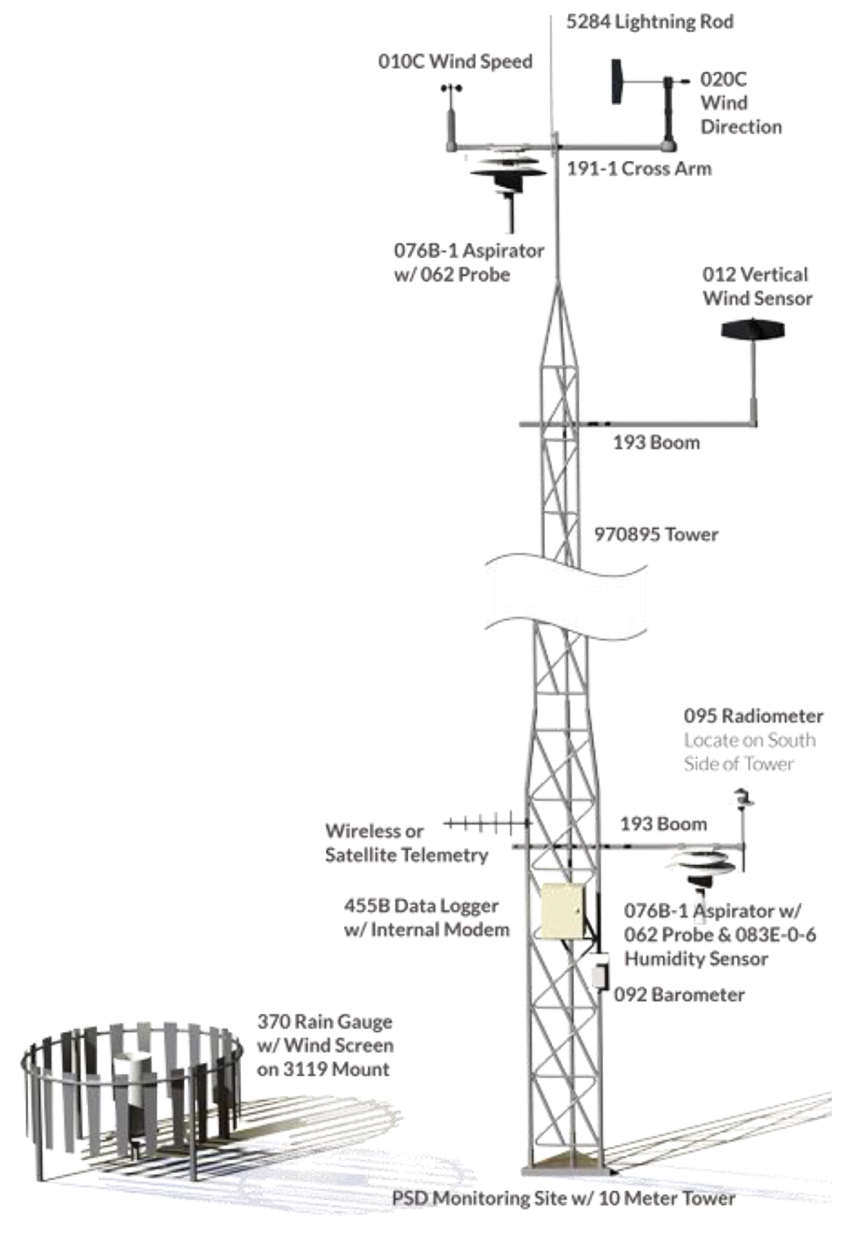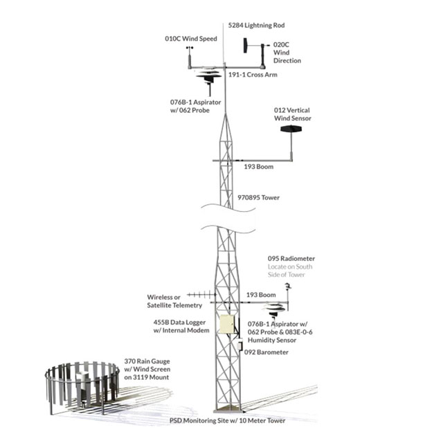 The Air Quality System includes performance compliant sensors, cables, mounting hardware, 10-meter tilt-over tower and data acquisition system. The weather station can be powered by AC or DC power, or an optional solar power system.