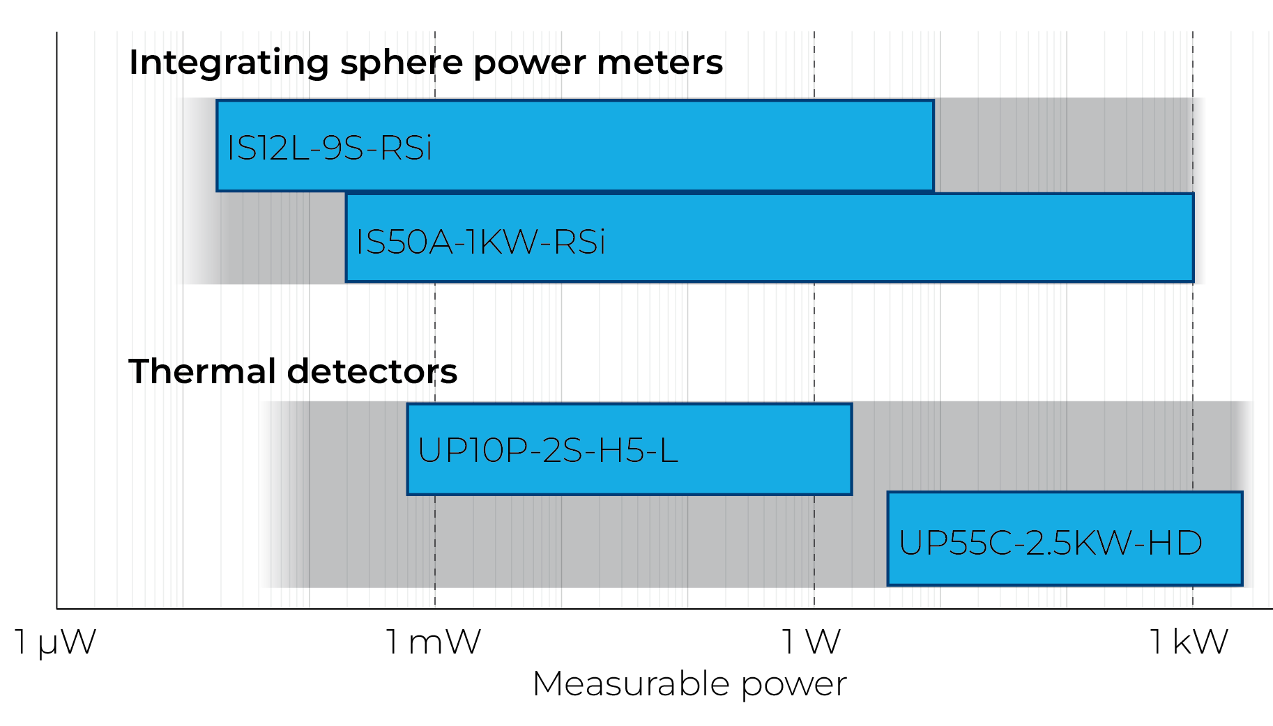 The broad dynamic range and very low noise equivalent power (NEP) of the IS integrating spheres provide users the ability to measure several lasers with different average powers with only one device.