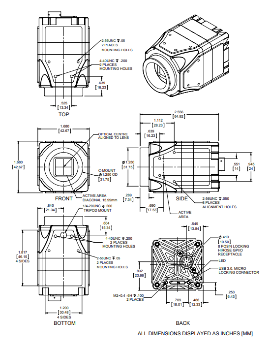 This C-mount Standard camera has a sensor depth from the front of the camera to the sensor of 17.5mm.