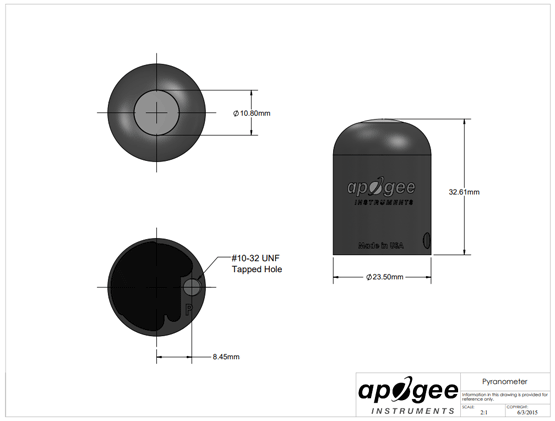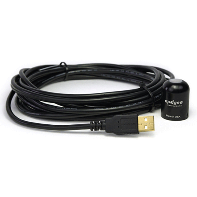 The sensor can be connected to a desktop or laptop computer via USB 2.0 type A plug, to be used with the ApogeeConnect software (Windows compatible, XP and later; Mac compatible, 10.10 and later). The included Apogee software gives the user control of data logging and calibration settings, provides a real time output display and graph of shortwave radiation measurements and allows the data set to be saved as a csv file.