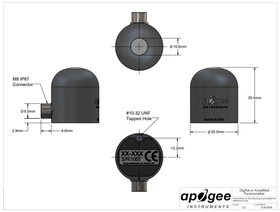 The SP-421 is a digital sensor with SDI-12 communication protocol. The sensor incorporates a silicon-cell photodiode with a rugged, self-cleaning sensor housing design, and high-quality cable terminating in pre-tinned pigtail leads for easy connection to dataloggers and controllers. Typical applications include shortwave radiation measurement in agricultural, ecological, and hydrological weather networks. Sensors are also used to optimize photovoltaic systems. Sensor includes IP68 marine-grade stainless-steel cable connector to simplify sensor removal and replacement for maintenance and recalibration.