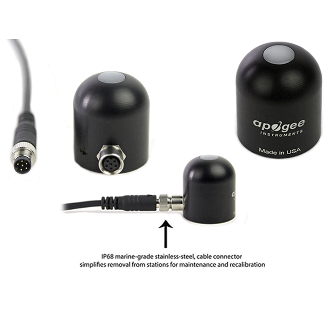 The SP-422-SS sensor outputs a digital signal using Modbus RTU protocol over RS-232 or RS-485. The sensor incorporates a silicon-cell photodiode with a rugged, self-cleaning sensor housing design, and high-quality cable terminating in pre-tinned pigtail leads for easy connection to dataloggers and controllers. Typical applications include shortwave radiation measurement in agricultural, ecological, and hydrological weather networks. Sensors are also used to optimize photovoltaic systems. Sensor includes IP68 marine-grade stainless-steel cable connector to simplify sensor removal and replacement for maintenance and recalibration.
