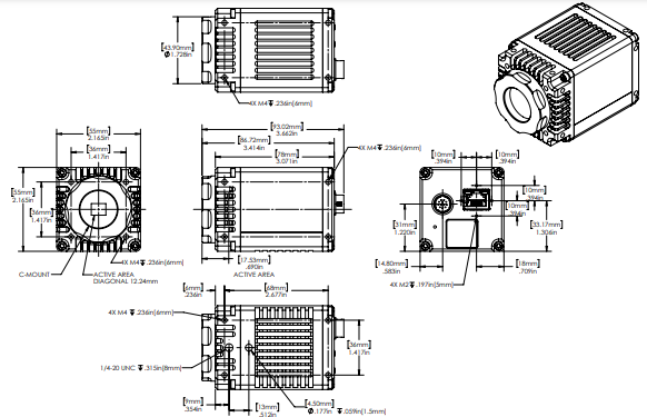 • Description: The SP1201 camera accurately captures and analyzes wavelengths from 900nm - 1700nm. It features a QVGA sensor, compact design, power over Ethernet, stabilized sensor cooling with no fan, and automatic
