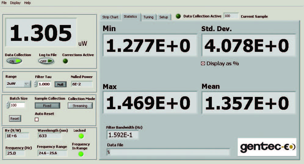 In the "Statistics" tab there are 4 large windows that contain the statistics for the selected batch, including: Minimum, Maximum, Standard Deviation and Mean, expressed in Engineering Notation. Standard Deviation can be displayed in Watts or as a % that is user-selectable. There is also a window that shows the bandwidth of the Digital Band Pass Filter based on the user selected "Filter Tau" (0.100 to 100 seconds). A lower time constant is helpful when setting up, and a longer one when making measurements, especially on the lower ranges of the instrument.